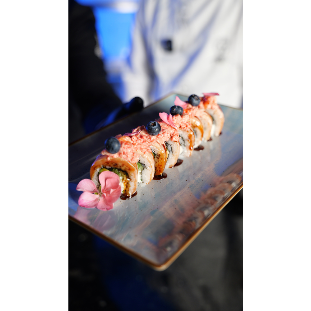 Cottage cheese, salmon, bleu sauce, pesto sauce, seasonal herbs
