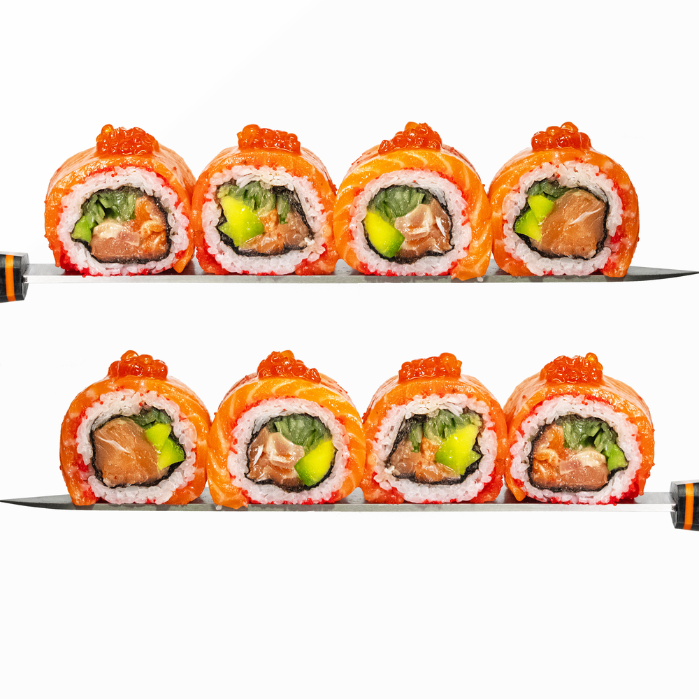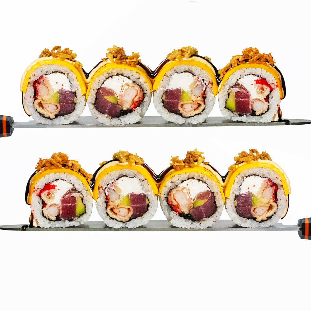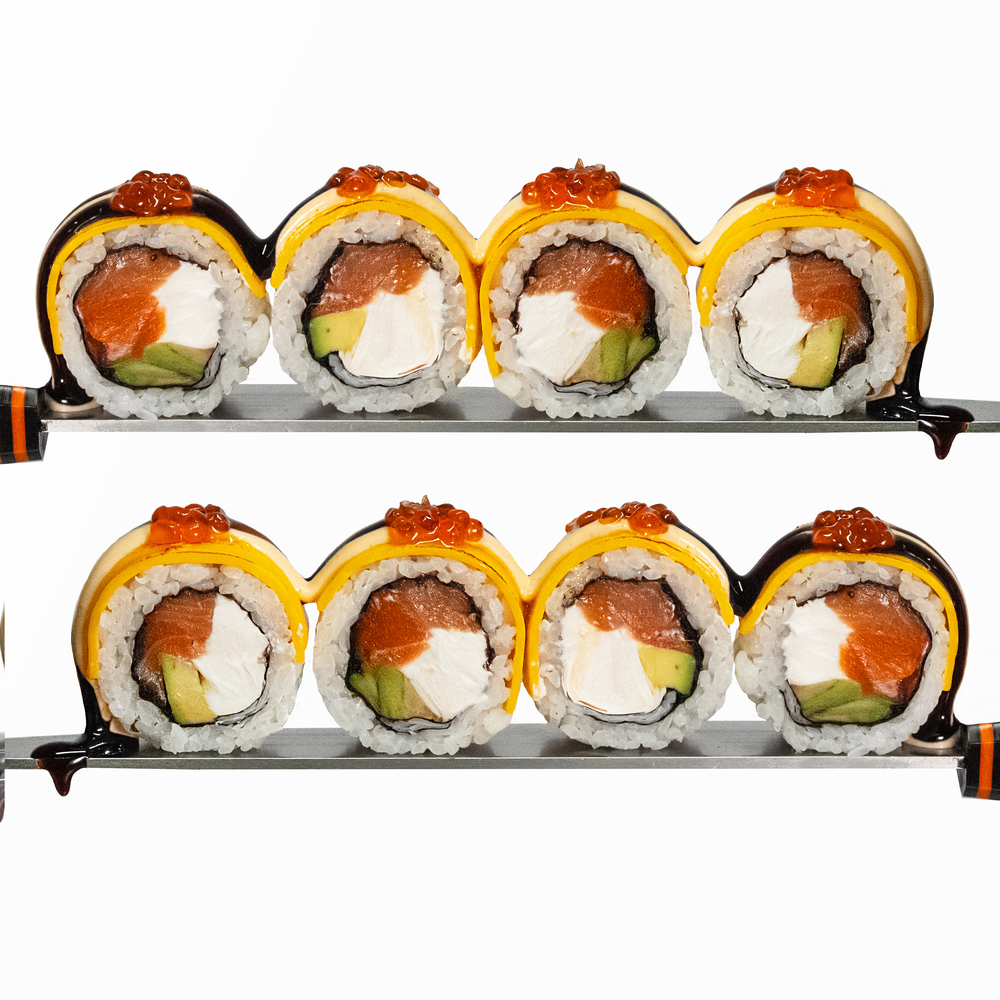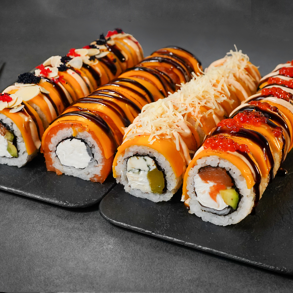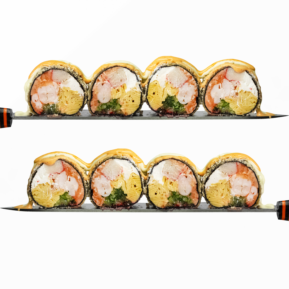 лосось,креветка, краб, крем-сир, огірок, омлет, ікра масаго, соуси чиллі майо, васабі айолі, сухарі панко |