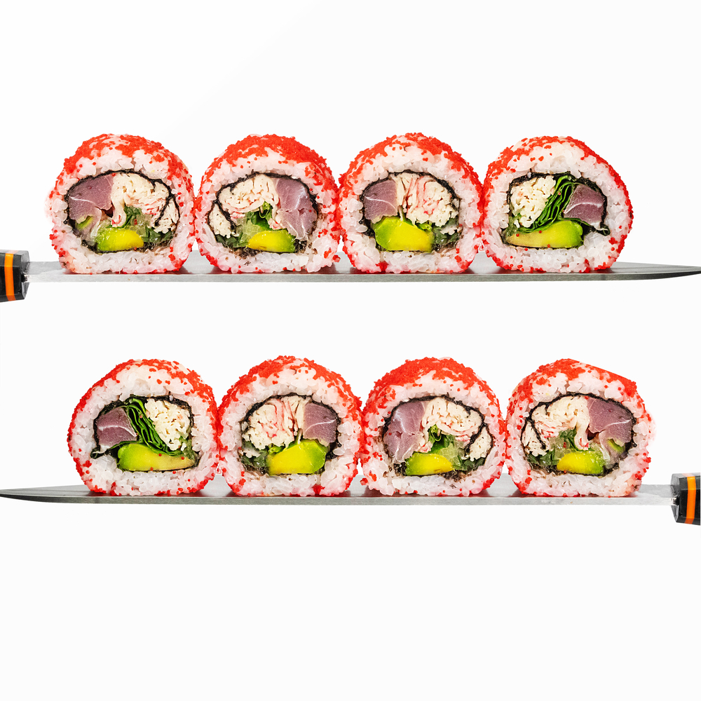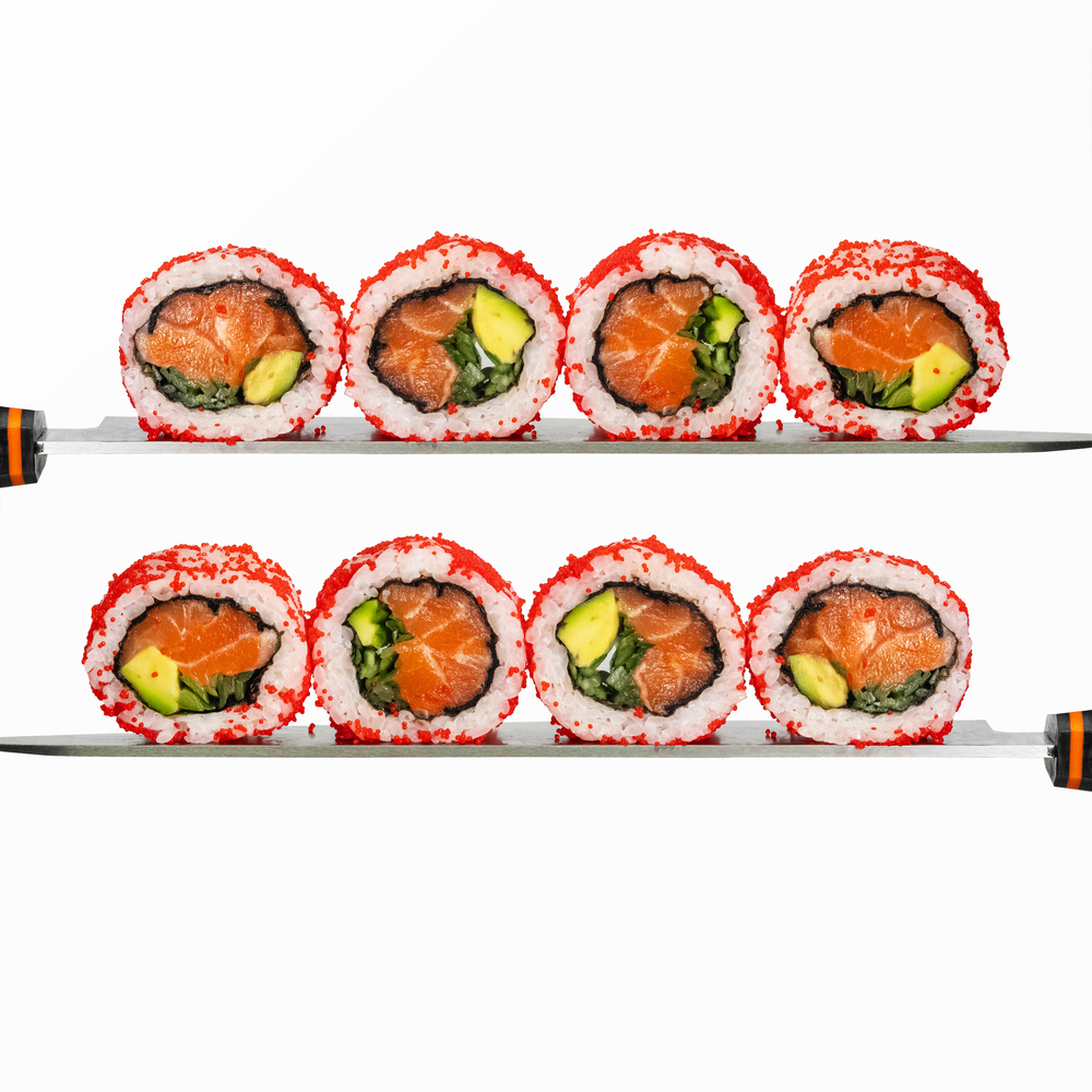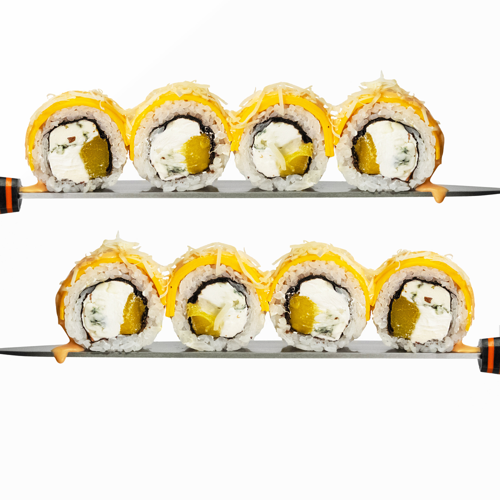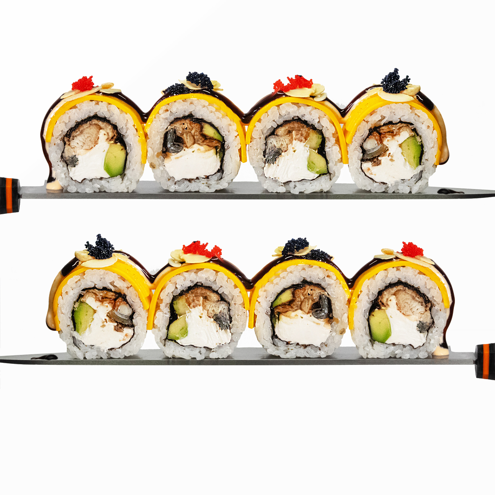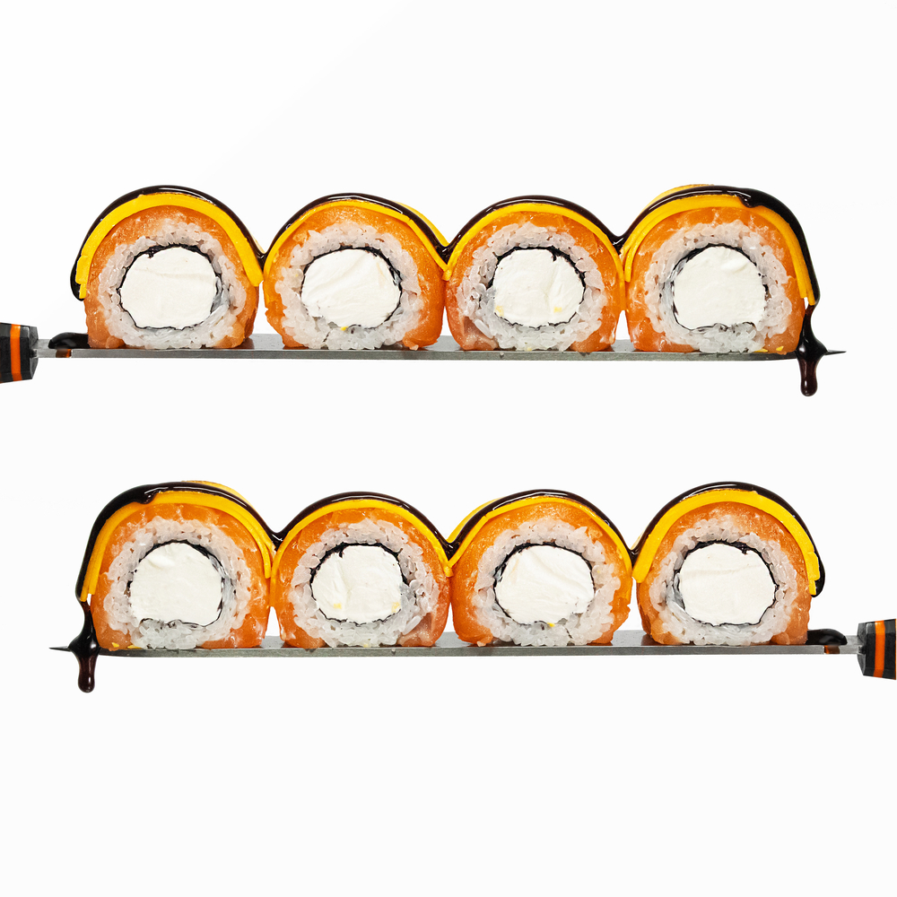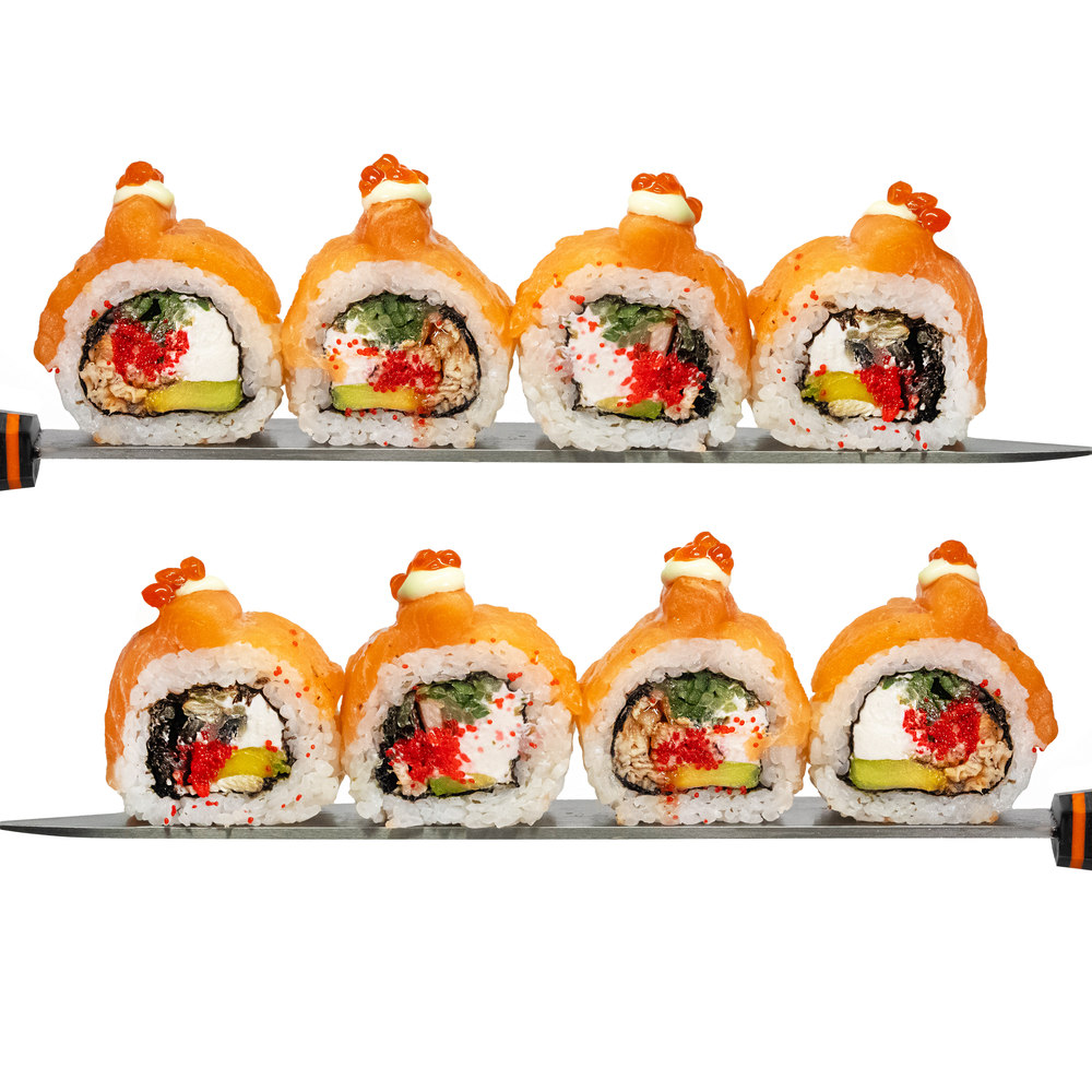 лосось,креветка, краб, крем-сир, огірок, омлет, ікра масаго, соуси чиллі майо, васабі айолі, сухарі панко |