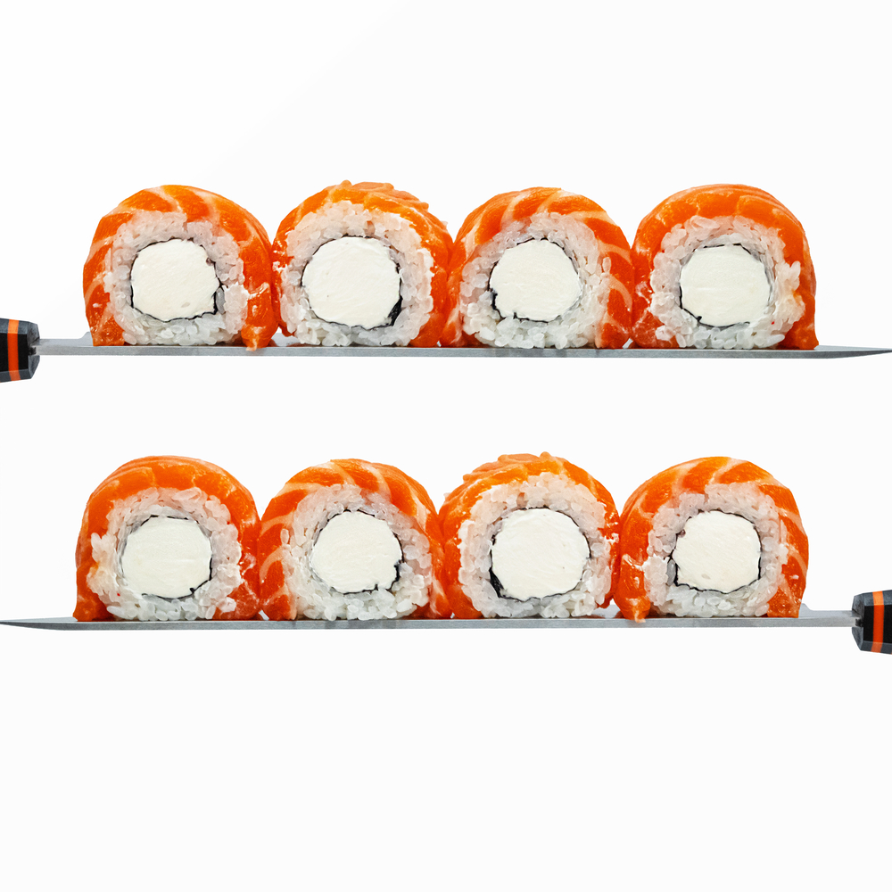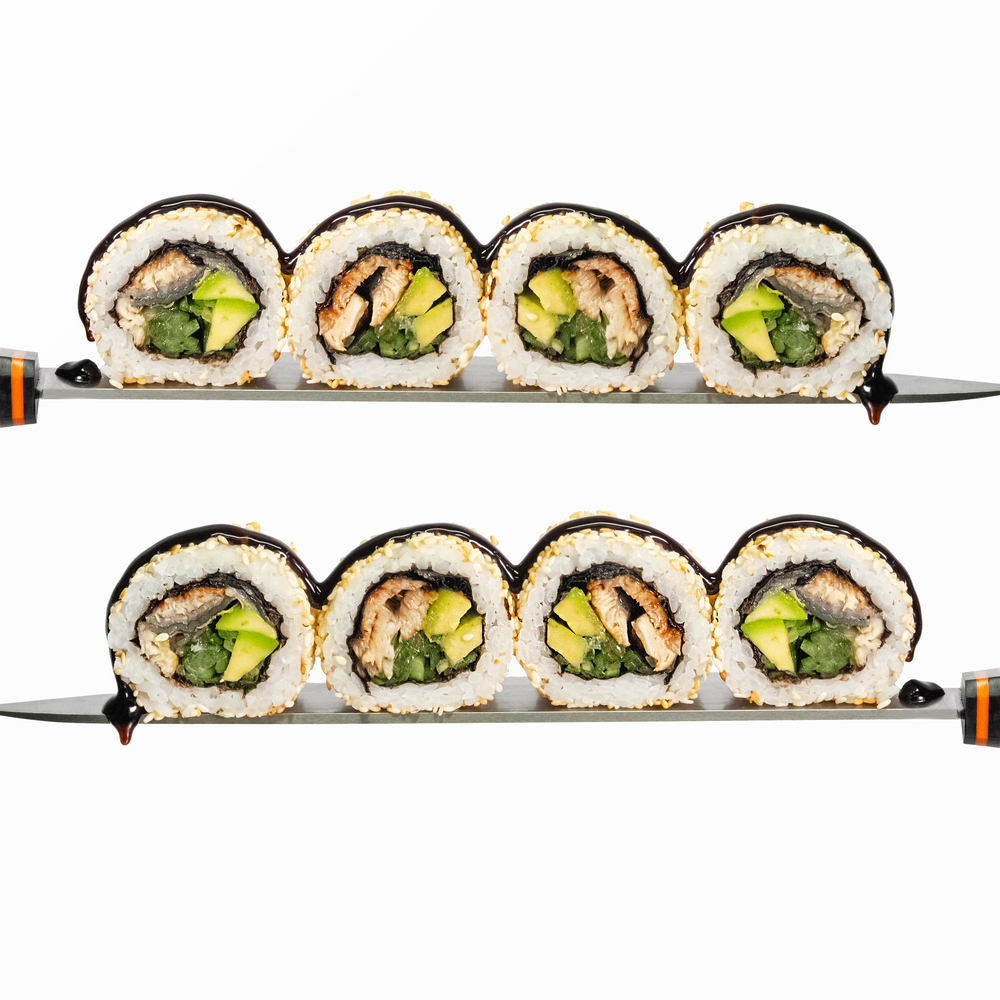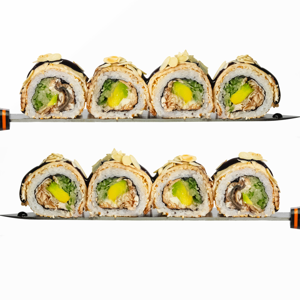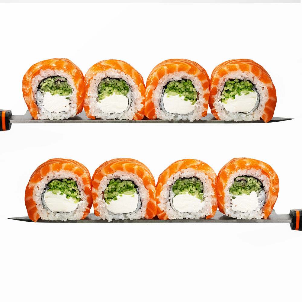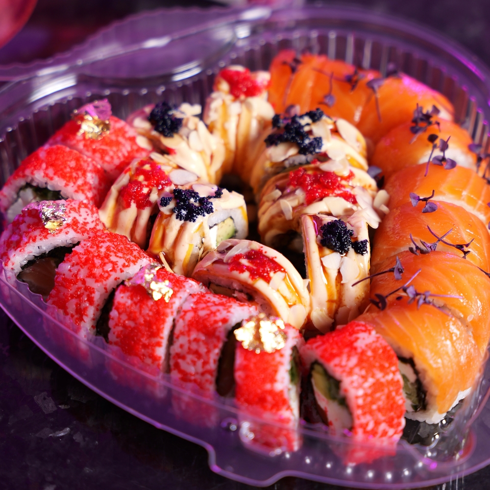 лосось,креветка, краб, крем-сир, огірок, омлет, ікра масаго, соуси чиллі майо, васабі айолі, сухарі панко |