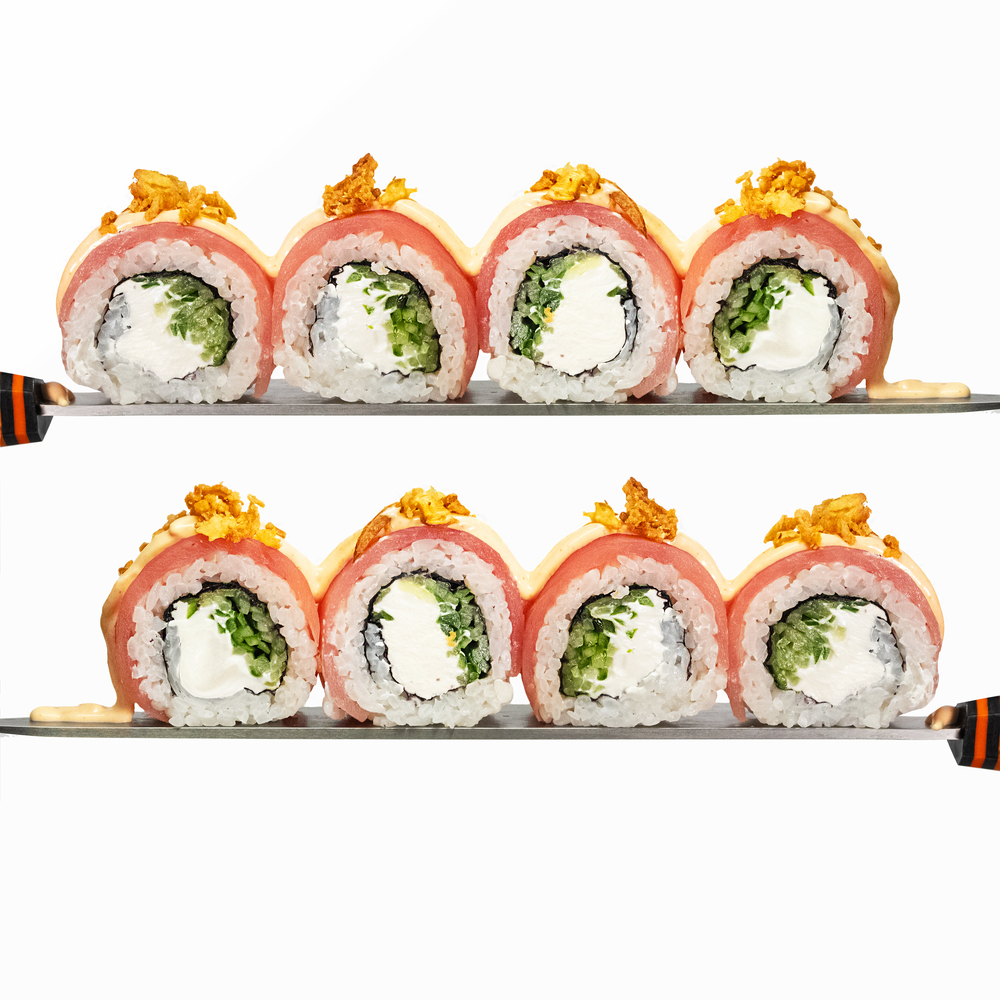тунець, крем-сир, огірок, кранч цибулевий, соус чилі майо |
