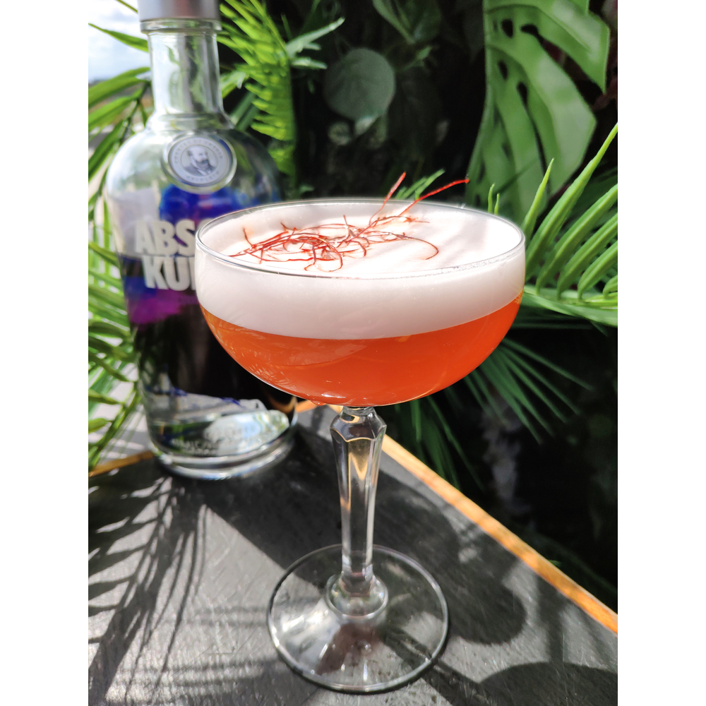 Сік: вишня та гранат з медом та спеціями(гвоздика та кориця), для гарного візуального ефекту(пінки) додаємо піноутворювач, та гарніруємо апельсином