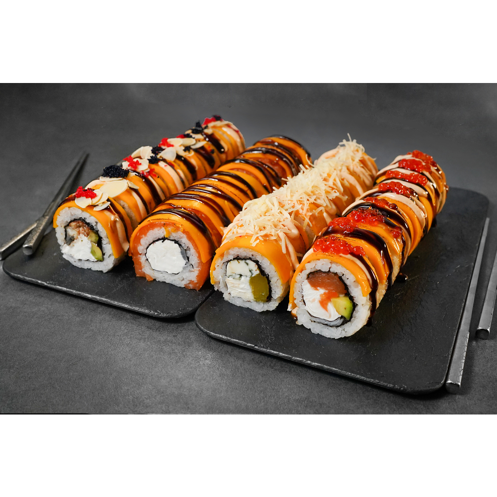 Рис, норі, лосось, вугор, огірок, авокадо, крем сир, ікра масаго, соус васабі, айолі, ікра червона